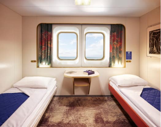 Außenkabinen sind ideal für alle, die die Überfahrt im Einklang mit dem Meer erleben möchten. Dank des Bullauges genießen Sie einen herrlichen Blick auf den Horizont und werden den ganzen Tag über vom natürlichen Licht begleitet, ohne auf den Komfort einer privaten Unterkunft zu verzichten.