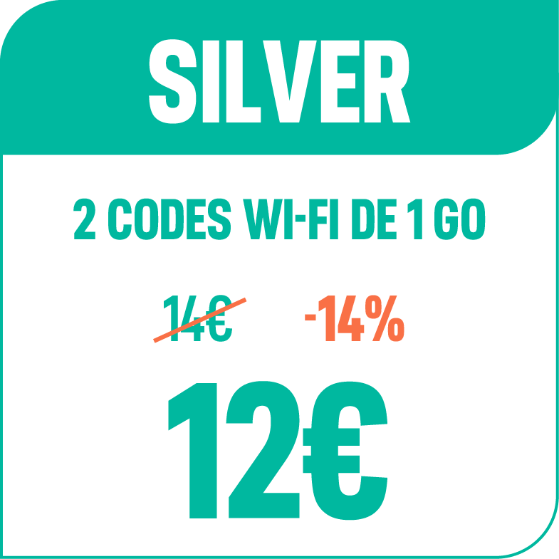 - Silver : 2 codes Wi-Fi de 1 Go à un prix spécial de 12 €, parfait pour rester en contact et naviguer sans souci.