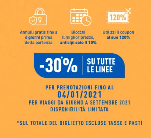 Al via la promozione “Summer 2021”: 30% di sconto e possibilità di modificare il biglietto fino a 4 giorni prima della partenza.