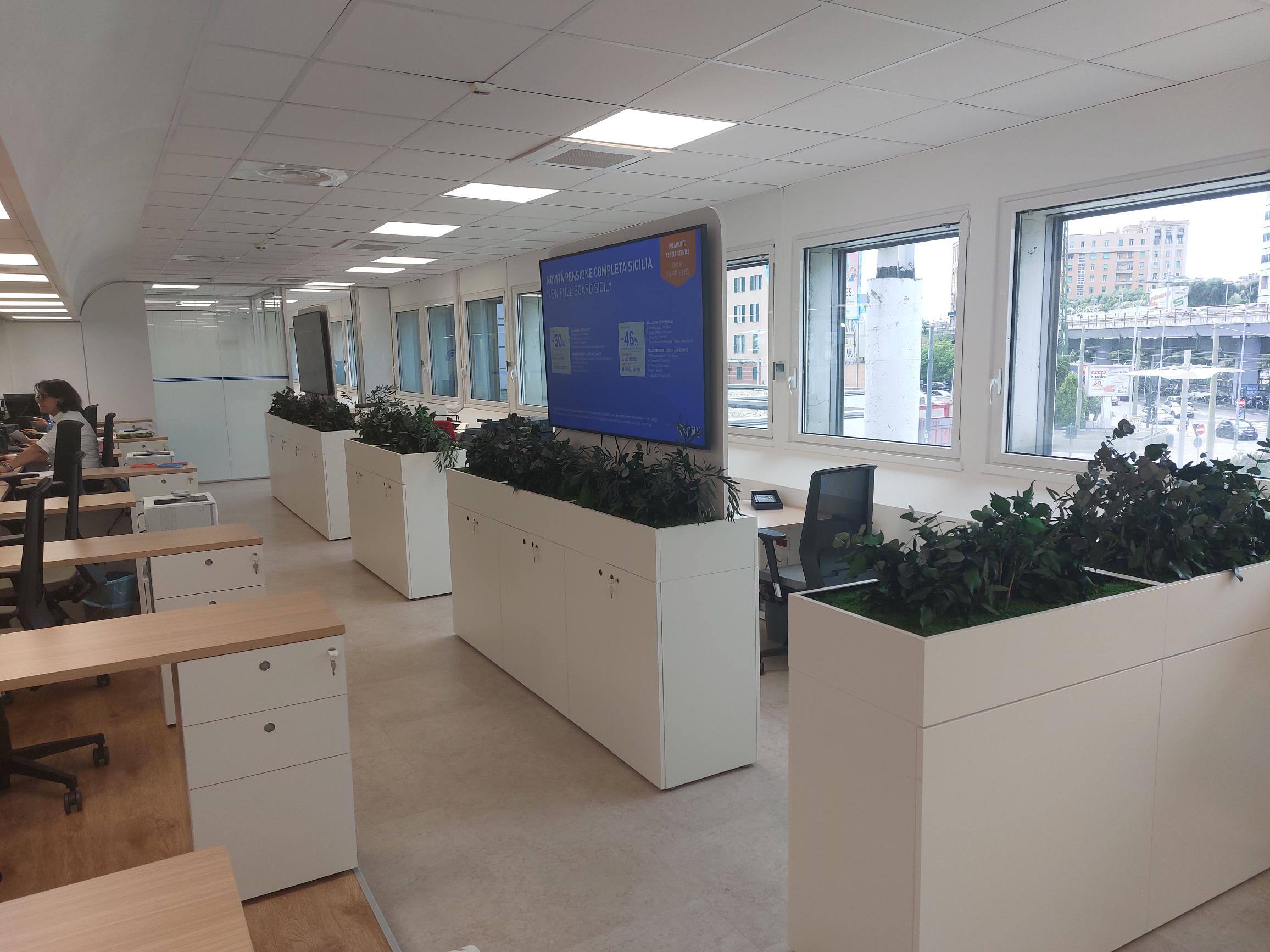 Le grandi vetrate, i numerosi e ampi monitor che caratterizzano i nuovi ambienti della biglietteria GNV permettono di creare un’immagine immediatamente riconoscibile per la clientela, oltre a dare un messaggio di assoluta trasparenza del business e anticipare l’esperienza di viaggio a bordo.